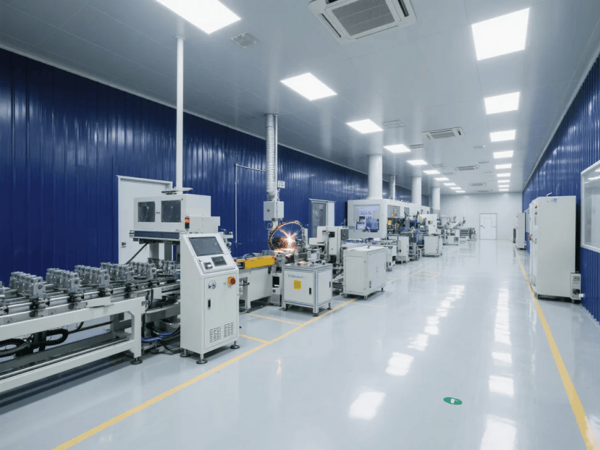 車間采用模塊化潔凈室結構,墻體采用50mm厚深藍抗菌彩鋼板,接縫處采用圓弧處理工藝。自動化沖壓線與激光焊接工作站呈U型交替布局,工作站間設置深灰不銹鋼傳遞窗,確保物料流轉潔凈度。吊頂系統配置FFU高效過濾單元,維持≥20次/h換氣次數,氣流組織采用頂送側回模式。