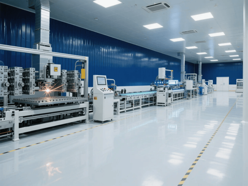 智能控制系統集成環境監測、設備聯動和MES數據看板,深藍墻面上嵌裝LED智能顯示屏,實時反饋生產數據。激光焊接區配備黃光防眩照明,工作站外圍設置淺灰環氧樹脂警示帶。整體設計通過冷色調的科技美學與自動化產線的有機結合,構建高效可靠的光伏材料智能制造空間。
