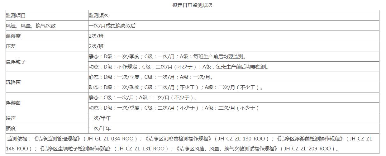 監(jiān)測依據:《潔凈監(jiān)測管理規(guī)程》(JH-GL-ZL-034-ROO);《潔凈區(qū)沉降菌檢測操作規(guī)程》(JH-CZ-ZL-130-ROO);《潔凈區(qū)浮游菌檢測操作規(guī)程》(JH-CZ-ZL-146-ROO);《潔凈區(qū)塵埃粒子檢測操作規(guī)程》(JH-CZ-ZL-131-ROO);《潔凈區(qū)風速、風量、換氣次數(shù)測試操作規(guī)程》(JH-CZ-ZL-209-ROO)。