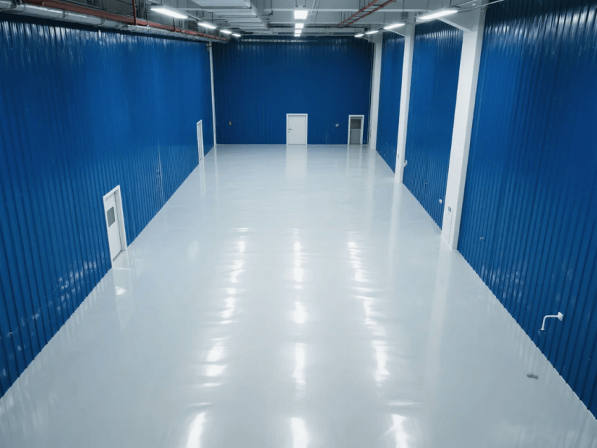 本方案以工業科技風為設計導向,打造符合ISO14644-1Class7標準的智能化注塑生產環境。空間主體采用深藍色彩鋼板墻體與淺灰防靜電環氧自流平地坪,形成冷峻而富有科技感的視覺層次。地面系統電阻值穩定控制在10^6~10^9Ω,兼具防靜電與耐磨特性,滿足精密注塑工藝需求。