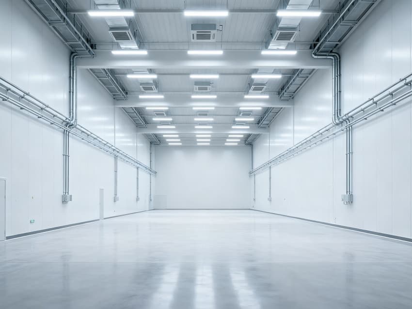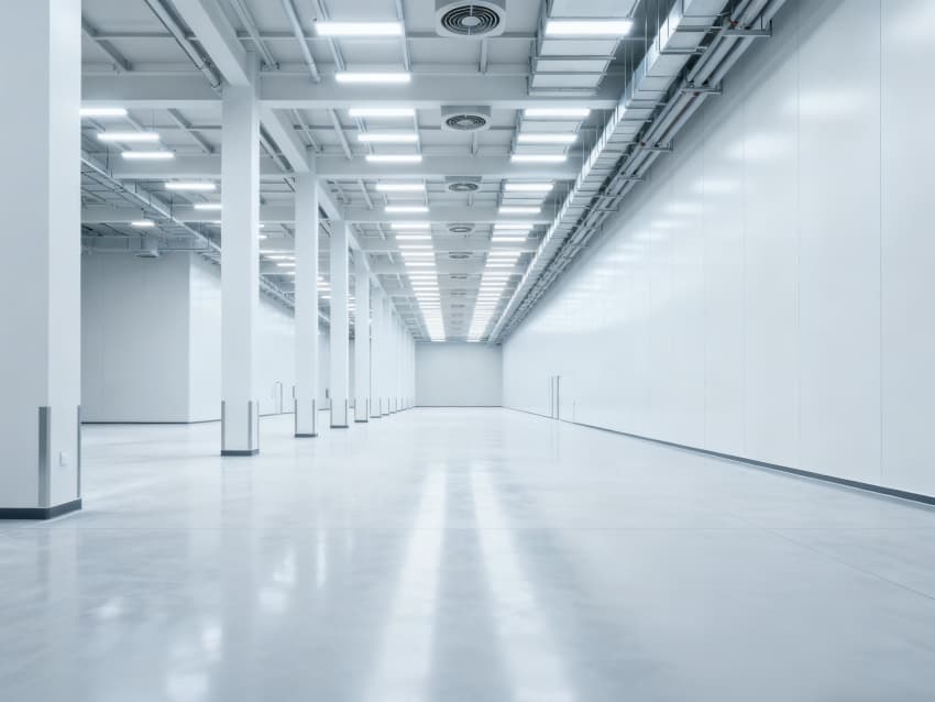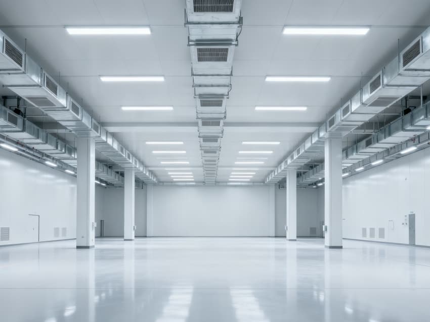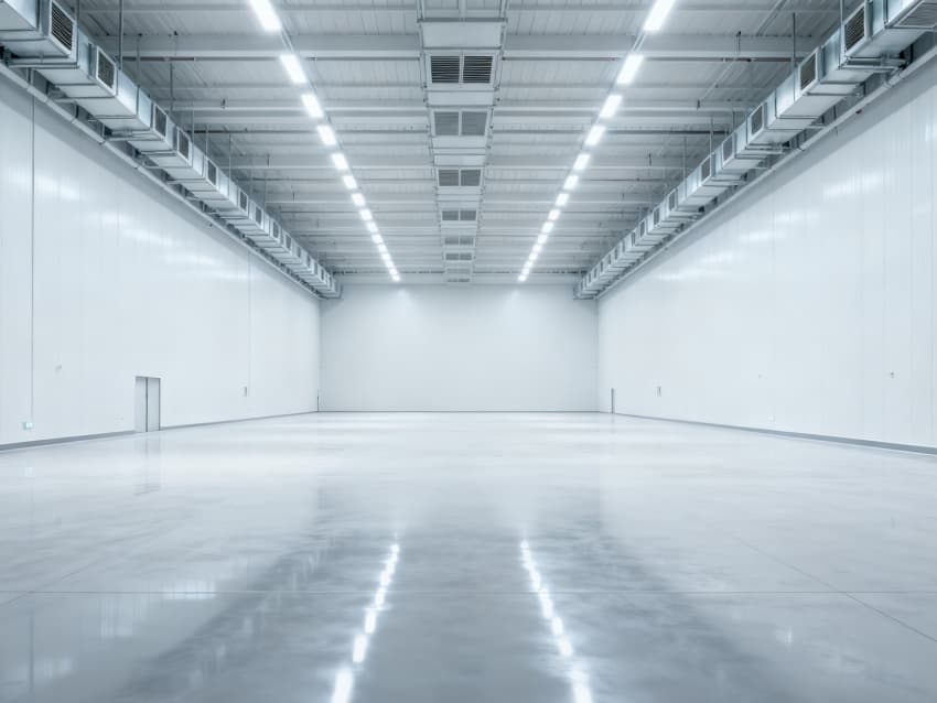 內部6個生產車間均為無設備空曠布局,按工業級潔凈與承重標準建設:地面鋪設耐磨防靜電環氧地坪,墻面采用白色環保潔凈墻板,陰陽角做圓弧處理減少積塵;柱網間距達10米,預留設備安裝與物流通道空間;頂部整合恒溫恒濕新風系統與節能LED照明,管線暗藏于吊頂內,避免空間雜亂;車間之間通過通透玻璃隔斷銜接,進一步強化整體空曠感,為新能源產品規?;a、柔性產線調整提供高效、潔凈的空間支撐。