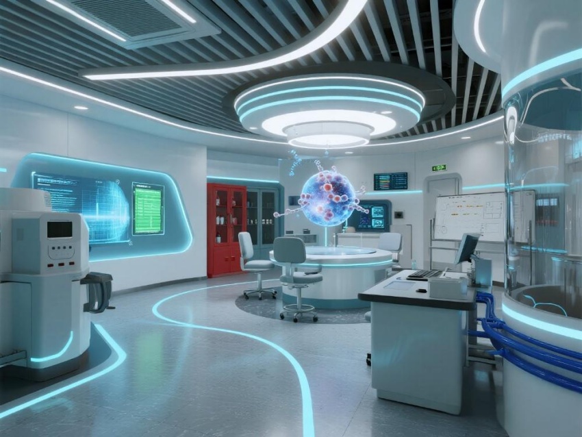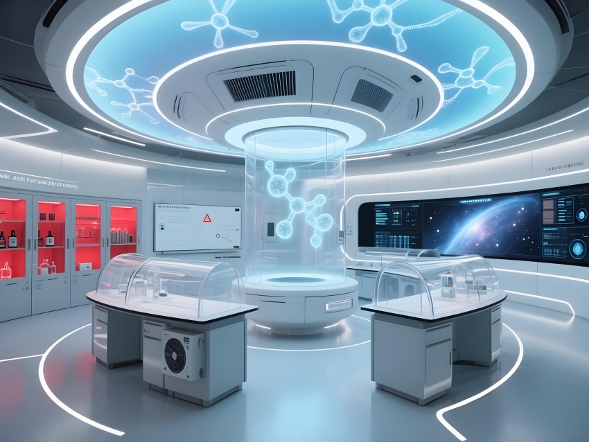 本實(shí)驗(yàn)室宛如一座精密運(yùn)轉(zhuǎn)的"環(huán)境圣殿",以"絕對(duì)環(huán)境控制"為靈魂信條。冰川藍(lán)與鈦白灰的漸變墻面如同極地冰原與金屬穹頂?shù)耐昝澜蝗冢度胧奖O(jiān)測(cè)屏上躍動(dòng)的翡翠綠數(shù)據(jù)流,恰似未來之泉在科技殿堂中潺潺流淌。圓弧形玻璃隔斷如同透明的生物繭房,百級(jí)潔凈層流罩在其中吐納著純凈氣流。地面鋪設(shè)的防靜電陶瓷鋼板閃爍著冷冽光澤,接縫處的LED指示燈如同守衛(wèi)環(huán)境標(biāo)準(zhǔn)的哨兵。銀色保溫管道與藍(lán)色冷媒管在設(shè)備區(qū)交織出工業(yè)交響曲,智能除濕機(jī)組半透明的外殼里,冷凝過程正在上演一場(chǎng)液態(tài)芭蕾。數(shù)據(jù)中控室270°曲面屏上,懸浮粒子濃度化作璀璨星云流轉(zhuǎn)。整個(gè)空間以幾何的嚴(yán)謹(jǐn)與流體的靈動(dòng)共舞,在科研的圣殿里譜寫出一曲星際交響詩(shī)。