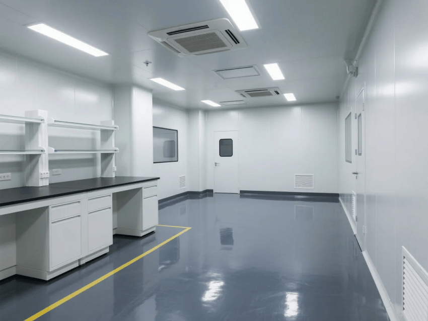 本工程嚴格遵循ISO14644-1Class7標準,采用"科技工業(yè)風"設(shè)計語言,打造高精度氣密檢測環(huán)境。實驗室以白色彩鋼板墻體與深灰環(huán)氧防靜電地坪形成鮮明視覺對比,營造兼具科技感與功能性的檢測空間。